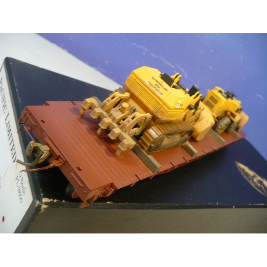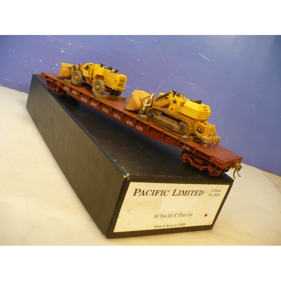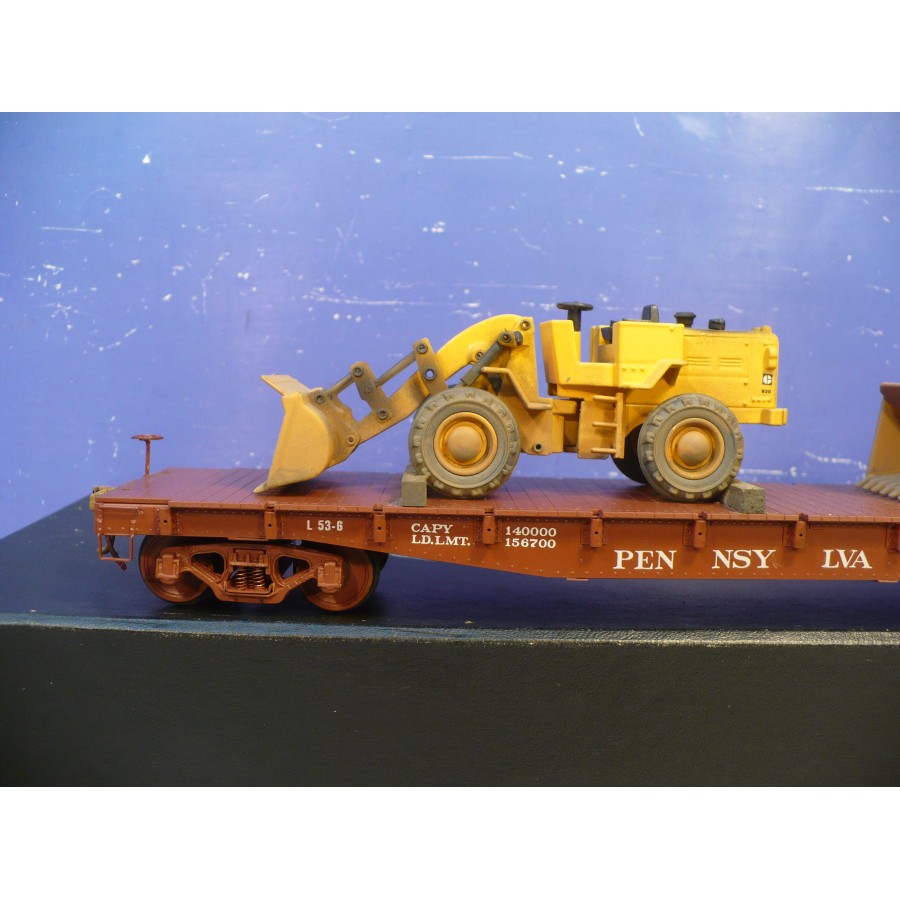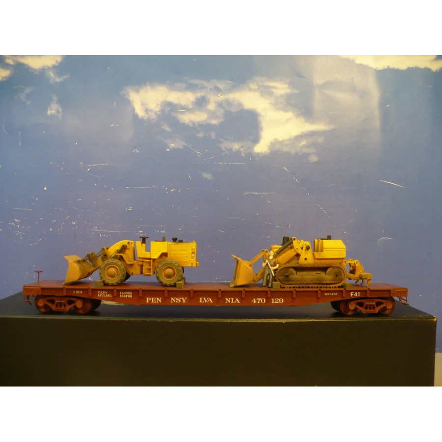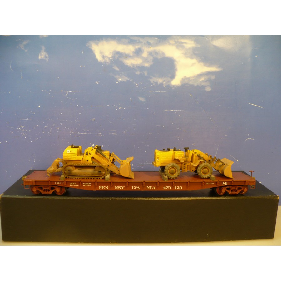 Excellent condition PL PRR 53' flat car, beautifully custom painted. Magnificently detailed with underbody and custom machinery load. PL sprung trucks and Kadees installed.