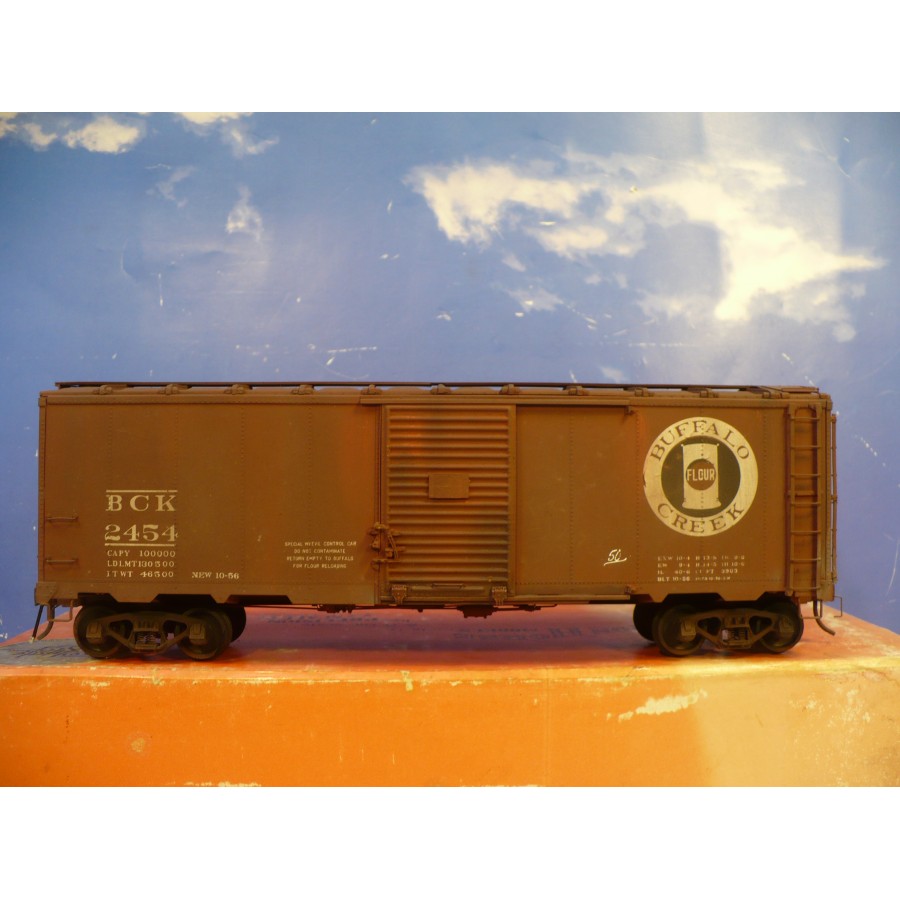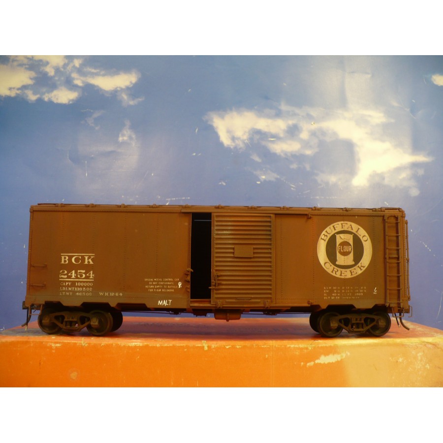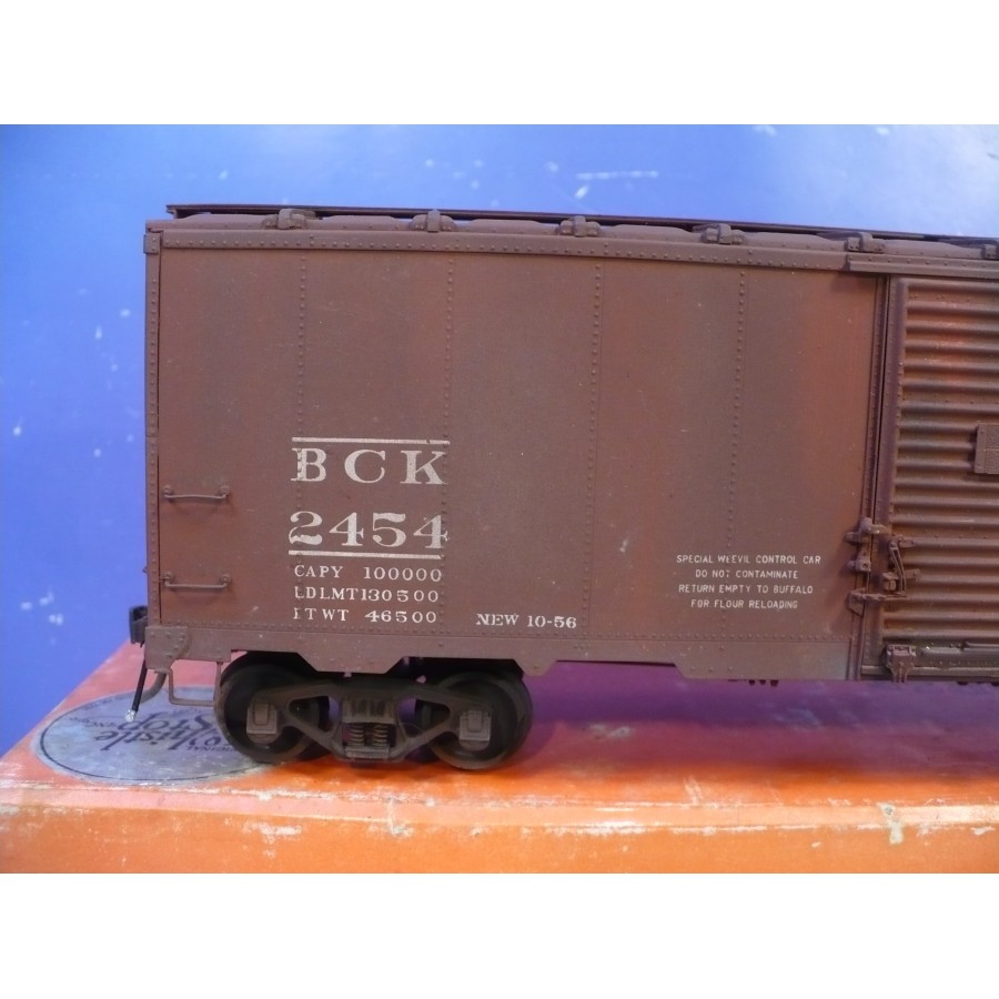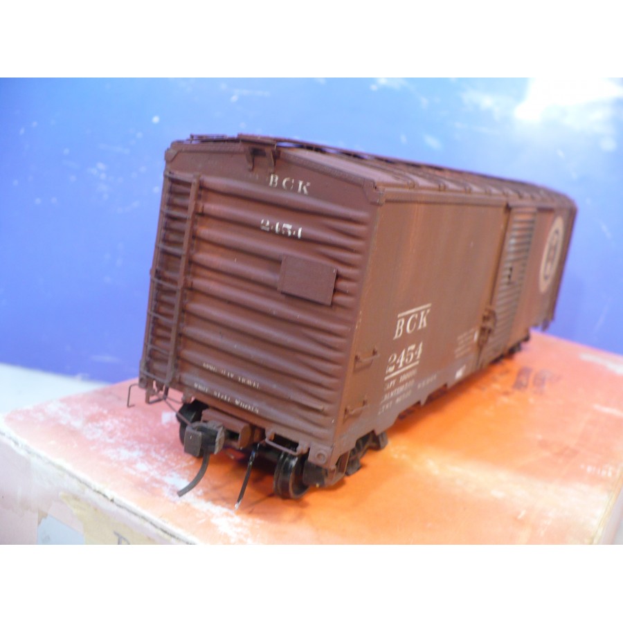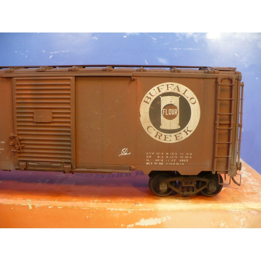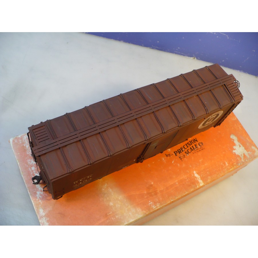 Excellent condition PSC BC box car, beautifully custom painted and weathered by John Clemons. Magnificently detailed with underbody, working doors. Athearn aprung trucks and Kadees installed.